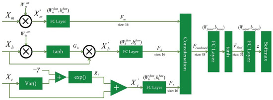 After modulation by the dynamic gates, the information enters a two-stage fusion process. First, the modulated output of each pathway (, , and ) is fed into its independent, fully connected network to extract and compress the core information within that domain. Concerning its implementation, the hyperbolic tangent (tanh) function is used as the activation function for these layers (17):