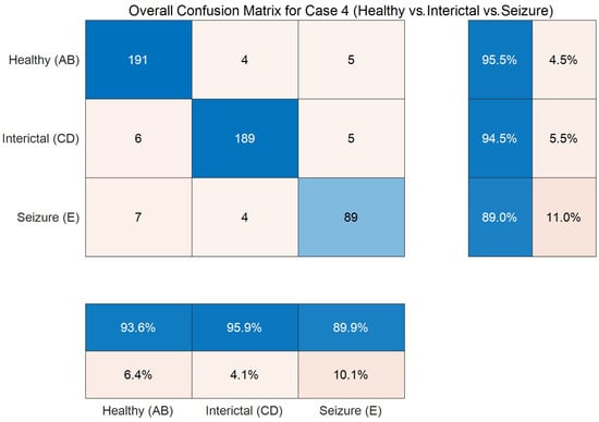 Case 4 is a three-class task that requires fine-grained discrimination among three neurological states. The model achieves an accuracy of 93.80% and an F1-score of 96.83%. Interestingly, this F1-score surpasses that of case 3. A possible explanation is that subdividing the non-ictal group into healthy and interictal classes helps the model establish clearer decision boundaries, which can prevent the conflation of distinct functional states. While case 4 exhibits slightly larger standard deviations for accuracy (±5.85%) compared to other binary tasks, the F1-score’s deviation (±2.90%) remains relatively low, indicating a robust balance between precision and recall even for the complex multi-class problem.