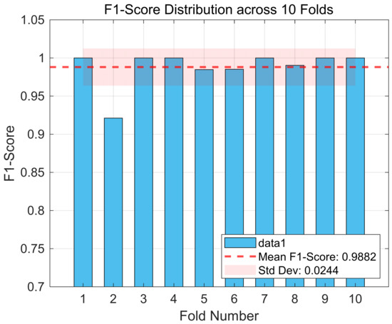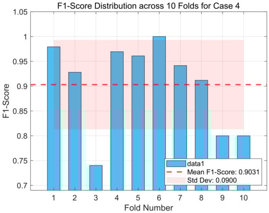 Additionally, Figure 4 displays the distribution of F1-scores obtained from the 10-fold cross-validation for case 4 of the Bonn dataset, assessing the consistency and robustness of the proposed DySC-MDE framework under varying sample partitions.