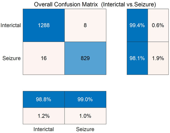 Confusion matrix on the binary classification task (CHB-MIT dataset) through 10-fold cross-validation.