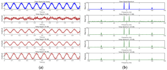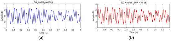 Based on Equation (17), we added 15 dB of Gaussian white noise. Figure 1 shows the original signal and the noise waveform.