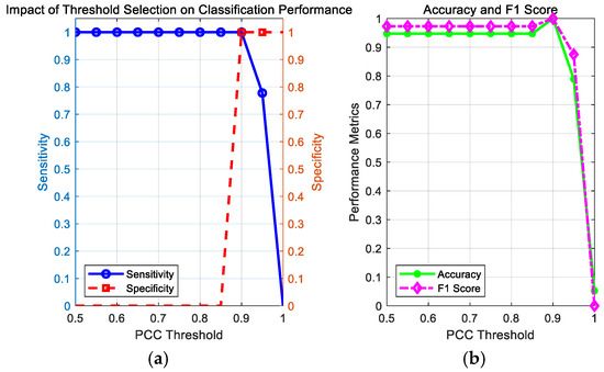 In Matlab2022a the threshold is set to 0.95, differing from the 0.2 threshold in [35]. We conducted a PCC threshold sensitivity analysis to discuss the impact of threshold selection on the classification results. We visualized the trends in sensitivity and specificity at different thresholds; sought a balance point where both sensitivity and specificity were high; considered the performance of accuracy and F1 scores; and determined the optimal threshold based on the intersection point or peak region of the curve. The impact of threshold selection on the classification results is shown in the figure below.