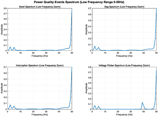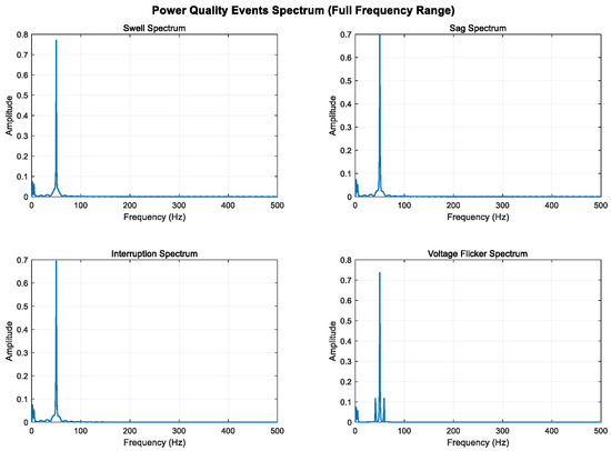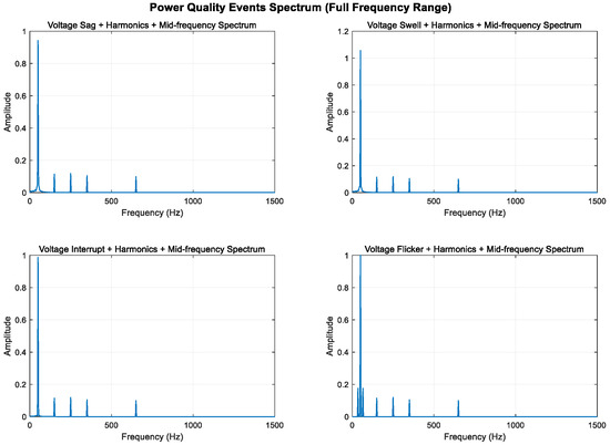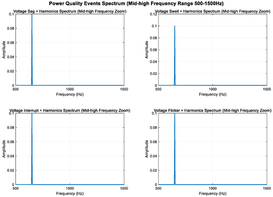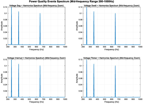 As shown in Figure 8, Figure 9 and Figure 10, higher sampling rates and longer time windows provide better frequency resolution (3000 Hz/2400 ≈ 1.25 Hz). These modifications make the mid-frequency components (350 Hz and 650 Hz) clearly visible in the spectrum diagram while maintaining the integrity of the original power quality components and harmonic characteristics.