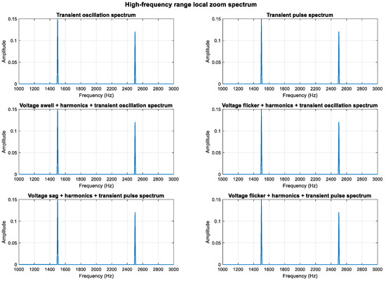 An analysis of the mathematical models shows that the composite perturbations of oscillation, pulse, and harmonic retain their respective characteristics. To highlight more high-frequency components, the sampling frequency was increased from 3000 Hz to 10,000 Hz, enabling an analysis of frequency components up to 5000 Hz. High-frequency sine components at 1500 Hz and 2500 Hz were added, increasing the transient oscillation frequency to 1500 Hz. The higher sampling rate provides better frequency resolution.