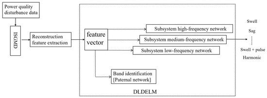 Electrical networks face operational challenges from power quality-affecting disturbances. Since disturbance signatures directly affect classifier performance, optimized feature selection becomes critical for accurate power quality assessment. The pursuit of robust feature extraction inevitably constrains the dimensionality of the discriminative feature set, but the complexity of the recognition model will be increased and the recognition speed will be reduced if the feature vector dimension is too high. Building upon the aforementioned requirements, in this paper, we propose a feature extraction framework that combines improved symplectic geometric mode decomposition, refined generalized multiscale quantum entropy, and refined generalized multiscale reverse dispersion entropy. Firstly, based on the intrinsic properties of power quality disturbance (PQD) signals, the embedding dimension of symplectic geometric mode decomposition and the adaptive mode component screening method are improved, and the PQD signal undergoes tri-band decomposition via improved symplectic geometric mode decomposition (ISGMD), yielding distinct high-frequency, medium-frequency, and low-frequency components. Secondly, utilizing the enhanced symplectic geometric mode decomposition as a foundation, the perturbation features are extracted by the combination of refined generalized multiscale quantum entropy and refined generalized multiscale reverse dispersion entropy to construct high-precision and low-dimensional feature vectors. Finally, a double-layer composite power quality disturbance model is constructed by a deep extreme learning machine algorithm to identify power quality disturbance signals. After analysis and comparison, the proposed method is found to be effective even in a strong noise environment with a single interference, and the average recognition accuracy across different noise environments is 97.3%. Under the complex conditions involving multiple types of mixed perturbations, the average recognition accuracy is maintained above 96%. Compared with the existing CNN + LSTM method, the recognition accuracy of the proposed method is improved by 3.7%. In addition, its recognition accuracy in scenarios with small data samples is significantly better than that of traditional methods, such as single CNN models and LSTM models. The experimental results show that the proposed strategy can accurately classify and identify various power quality interferences and that it is better than traditional methods in terms of classification accuracy and robustness. The experimental results of the simulation and measured data show that the combined feature extraction methodology reliably extracts discriminative feature vectors from PQD. The double-layer combined classification model can further enhance the model’s recognition capabilities. This method has high accuracy and certain noise resistance. In the 30 dB white noise environment, the average classification accuracy of the model is 99.10% for the simulation database containing 63 PQD types. Meanwhile, for the test data based on a hardware platform, the average accuracy is 99.03%, and the approach’s dependability is further evidenced by rigorous validation experiments.