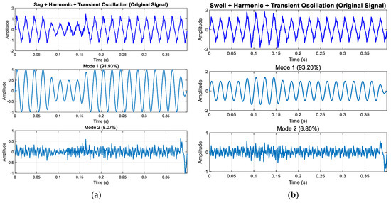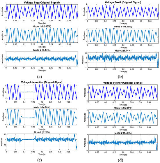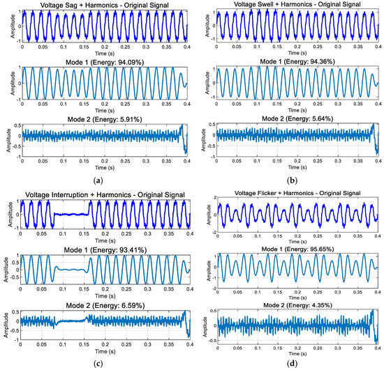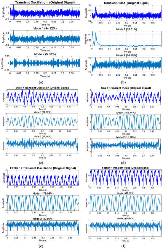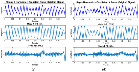 The signal decomposition analysis results in Figure 25 show that ISGMD can effectively separate complex power signals. Mode 1 accounts for over 90% of the total energy, primarily reflecting the fundamental and harmonic components of the signal, exhibiting regular sinusoidal characteristics; Mode 2 contains the remaining small energy components. Figure 25c,d further validate the effectiveness of this decomposition method, with Mode 1 occupying the majority of the signal’s total energy, successfully extracting the dominant periodic components of the signal.