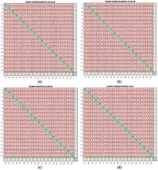 Due to the limitations of the instrument signal source, this experiment was conducted using only 14 types of single and double composite disturbances for analysis. For each type of signal, 20 groups of signals were generated, with each sample having a sampling frequency of 12.8 kHz and a duration of 0.2 s. Table 13 details the algorithm’s experimental outcomes.