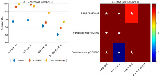 Based on the data in Table 8 of this manuscript, a performance comparison and statistical significance analysis of the three entropy feature methods were conducted under a 95% confidence interval, and a table listing the performance indicators of the 95% CI was compiled.