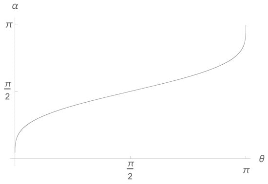 The relation between and as given by (51). There are three fixed points: , , . Here, is the geometric angle between the two Stern–Gerlach devices, whereas is a hidden parameter.
