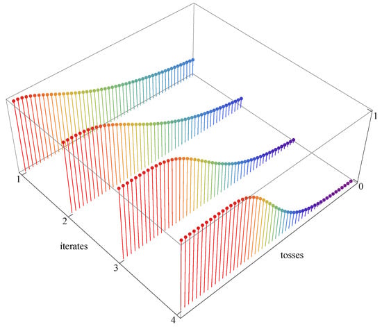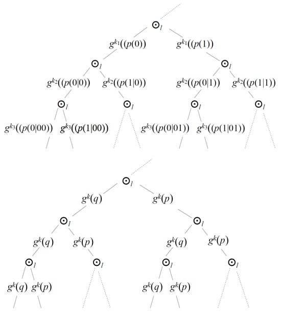for any . Indeed, how to distinguish between (36)–(38) and (39)–(41), if we bear in mind that k can be positive, negative, or zero, and the formulas are true for all k? How to distinguish between the two levels if in both cases we find and ? Which of the probabilities, p or P, is the one we measure in experiment? Which iterate, k, 0, or , is the one that defines our probabilities we experimentally define in terms of frequencies of successes? Which natural numbers , , or , are the ones we use to define numbers of trials and successes?