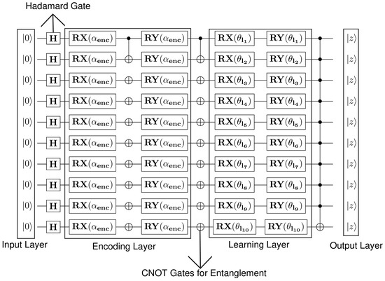 - QNN: The model is implemented as a layered variational circuit with L blocks. Each block comprises a data encoding layer, parameterized rotation layer and entangling layer. The unitary block l is given byThe expected value of the first qubit was estimated and mapped to probability via . The network was trained using the parameter-shift rule and Adam optimizer.