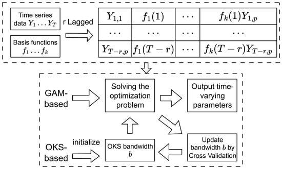 and the coefficient bound vector is . A key component of the OKS method is the selection of bandwidth b. Larger bandwidths improve smoothness but risk underfitting, while smaller values may lead to overfitting by capturing noise. To address this, cross-validation is commonly employed to select an optimal b, as it effectively balances bias–variance trade-offs and adapts to diverse data structures via empirical risk minimization. The resulting optimization is typically solved using numerical techniques akin to those in the GAM framework. Finally, the workflows of both GAM- and OKS-based TV-AR/TV-VAR models are summarized in Figure 1.