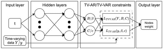 where denotes the total loss function incorporating both the data-driven and physics-informed components. Specifically, the structural constraints in TV-AR and TV-VAR models cannot be directly expressed as physical laws, making them less compatible with the standard framework of PINNs. This limitation arises because the model coefficients vary over time, preventing the entire system from being expressed as a single, time-invariant differential or algebraic equation. On the other hand, traditional deep learning-based approaches in time series analysis focus on directly estimating or forecasting the observed trajectories , as seen in applications like long-term structural health monitoring [49] and neurodegenerative disease modeling [50]. However, these end-to-end models often struggle to disentangle intrinsic temporal dynamics from noise or exogenous influences and tend to overlook the foundational mathematical structure of autoregressive processes, which are essential for interpretable and stable modeling of dynamic systems. This limitation becomes even more pronounced in time-varying autoregressive settings, where accurately capturing the evolution of coefficient matrices and intercept vectors over time is critical yet challenging. Therefore, in the context of time-varying processes, a more principled modeling strategy should prioritize learning the time-dependent coefficient matrices and intercept vectors rather than directly modeling the observed series , as these components more accurately characterize the system’s evolving dynamics, enable structural identification, and capture underlying temporal dependencies. From this perspective, the loss function of TV-VAR(r) at time t can be expressed as follows: