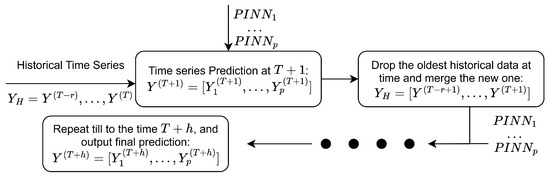 where in TV-AR, denotes the time-varying intercept term, while represents the time-varying autoregressive coefficient for the first lag at time t. The noise term is assumed to follow a Gaussian distribution with zero mean and variance . Similarly, in the TV-VAR model, is the time-varying intercept vector, and denotes the time-varying coefficient matrix for the first lag at time t. The multivariate noise term follows a Gaussian distribution with zero mean and covariance matrix . Subsequently, to evaluate the forecasting accuracy of the proposed PINN-based methods, the mean absolute error (MAE), as defined in Equation (10), is computed over a forecast horizon of length .