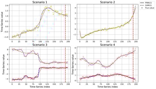Next, the L-BFGS-B algorithm from the SciPy optimization suite, a limited-memory quasi-Newton method known for its efficiency and fast convergence, was employed in the PINN-based approach, while the GMA- and OKS-based methods utilized the ‘trust-constr’ algorithm, which is also from SciPy and built on a constrained optimization framework using Lagrangian gradient descent. Both algorithms are well suited for efficiently handling large-scale optimization problems, particularly those arising in high-dimensional PINNs training. Finally, to rigorously evaluate the performance of the PINN-based model, we applied it across Scenarios 1 through 4 for full-horizon reconstruction with lag , using the GAM-based approach as a baseline. Both models were trained on 95% of each synthetic time series comprising 200 data points, where the first 190 samples were used for model fitting and the remaining 10 were reserved for out-of-sample validation. After training, recursive multi-step prediction was performed: the model uses one initial lagged input to iteratively forecast the next point, updating the input window with each predicted value. This autoregressive roll-forward strategy continued until all 199 steps were reconstructed, enabling pointwise comparison against ground truth across the full temporal span. In contrast, the OKS-based and stationary VAR approaches were omitted from this analysis due to their inherent reliance on (local) stationarity assumptions, which constrain their capacity to capture the time-varying dynamics exhibited in these scenarios. All experiments were conducted on a workstation powered by an NVIDIA RTX 3050 Ti GPU and an AMD Ryzen 7 5800H CPU, utilizing GPU acceleration for batched matrix computations and neural network inference to significantly enhance training efficiency.