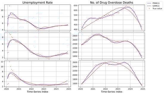To assess the effectiveness of our proposed methods on real-world health data, we trained the TV-VAR model under all frameworks using data from 1 January 2020 to 1 November 2024, with lag orders . The trained models were subsequently used to predict values for 1 December, using the PINN framework with a ‘tanh’ activation function, neural network architectures containing 5 and 10 neurons per layer, and a maximum number of iterations ranging from 800 to 1200. The predicted results were compared against the actual observations , with absolute errors reported for the unemployment rate (RU) and the number of drug overdose deaths (DODs), as summarized in Table 6. Furthermore, leveraging the GAM- and PINN-based approaches with lag , we reconstructed the entire time series and compared the resulting trajectories against the ground truth, as illustrated in Figure 5.