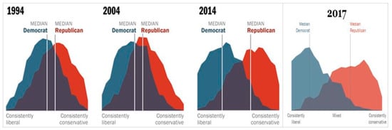 - Dimock, M.; Doherty, C.; Keeter, S.; Kiley, J. Political Polarization in the American Public; Pew Research Center: Washington, DC, USA, 2014. [Google Scholar]