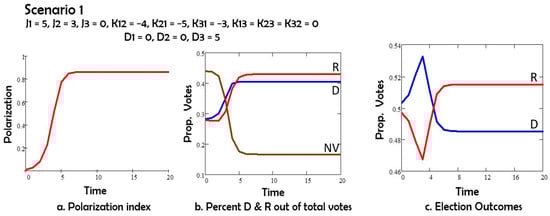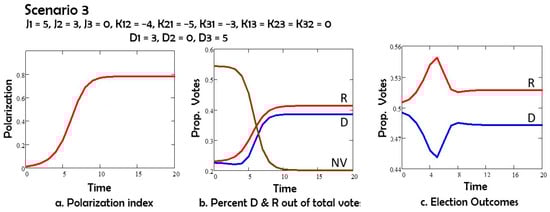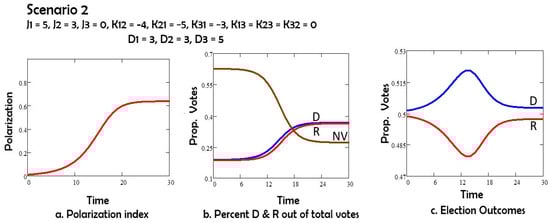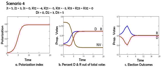 In Scenario 3 (Figure 4) we consider that the depolarization field D acts on Democrats but not on Republicans: D1 = 3, D2 = 0. The Republicans win the election under this assumption.
