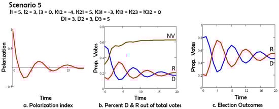 In Scenario 5 (Figure 6) we consider that K21 and K12, the interactions between Democrats and Republicans, have opposite signs. As a result, time oscillations emerge. Then the election result depends on the date at which the voting occurs.