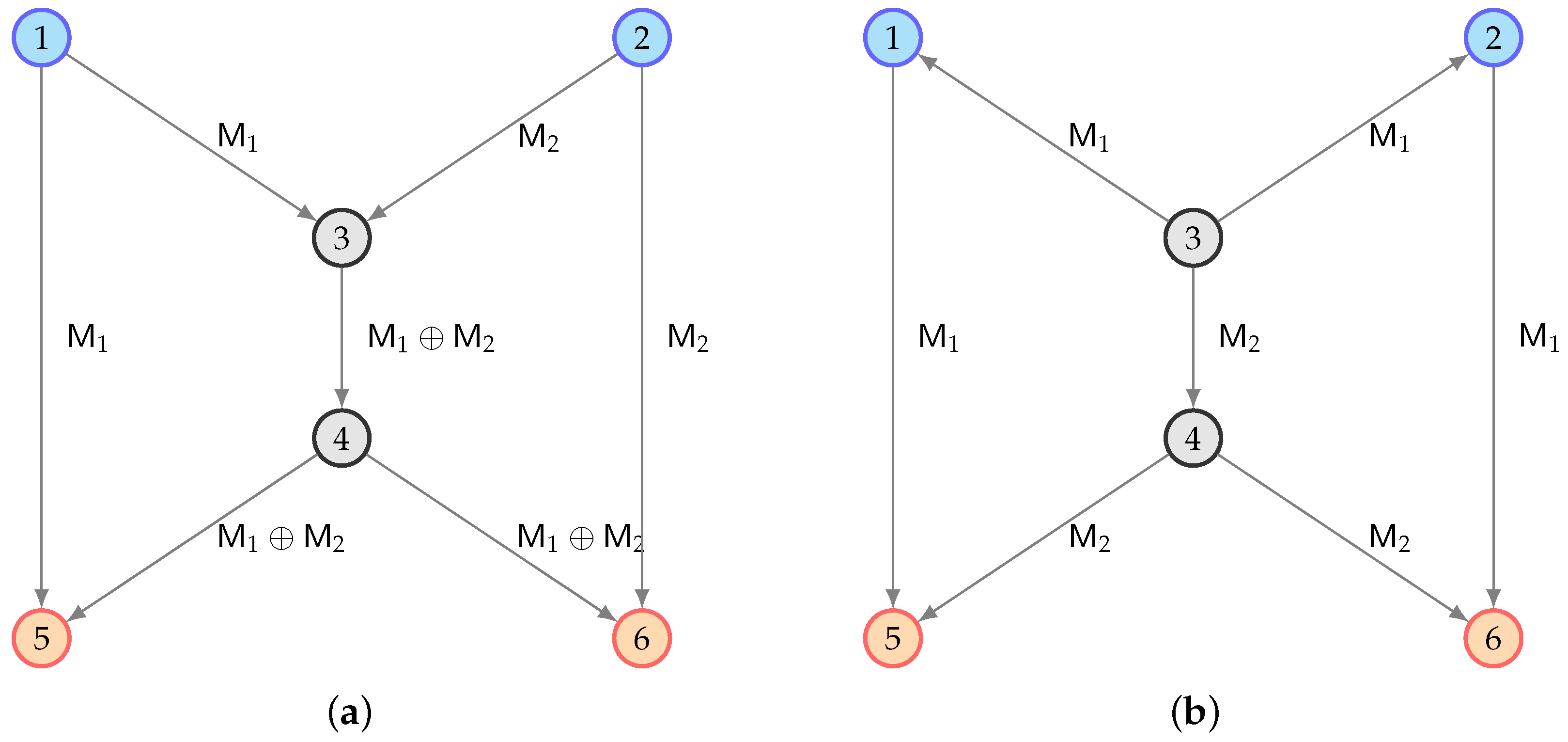 - Ahlswede, R.; Cai, N.; Li, S.Y.; Yeung, R.W. Network information flow. IEEE Trans. Inf. Theory 2000, 46, 1204–1216. [Google Scholar] [CrossRef]