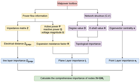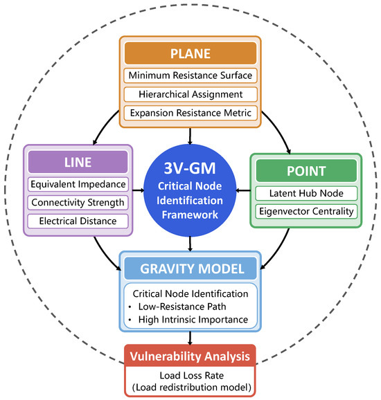 We propose a multi-dimensional critical node identification framework for power networks, namely 3V-GM, which integrates “point–line–plane” features, as illustrated in Figure 1. In the plane layer, a minimum-resistance surface model is constructed by introducing a resistance factor and combining K-shell values with degree centrality, enabling a comprehensive assessment of node importance based on both the global topological centrality and local connectivity density. In the line layer, an electrical coupling distance is introduced to quantitatively describe the impedance characteristics of power transmission paths, revealing potential cascading failure channels. In the point layer, eigenvector centrality is used to identify latent hub nodes with global influence that are often overlooked by traditional centrality measures. Based on the multi-dimensional information, we further develop a gravity model-based evaluation system to achieve the unified integration of the extracted features. The resulting method effectively identifies critical nodes with high potential energy located along low-impedance paths, offering strong theoretical support for power grid stability assessment and control strategy optimization.