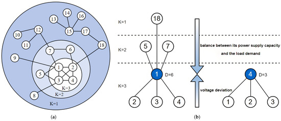 Structural hierarchy and expansion resistance-based evaluation in the plane layer. (a) K-shell decomposition diagram. (b) Illustration of the improved plane-layer evaluation. Although nodes 1 and 4 belong to the same K-shell layer, they differ in degree, structural influence, power supply–demand characteristics, and voltage deviation, resulting in significant differences in importance. Therefore, the expansion resistance factor is introduced to provide a more comprehensive evaluation of each node’s operational stress and criticality.