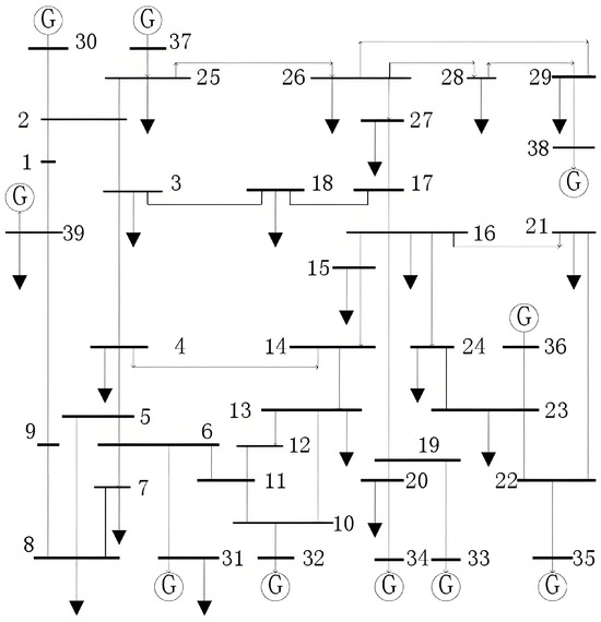 Taking the IEEE39-node system as an example, the network structure is shown in Figure 5. The IEEE 39-node system and other IEEE systems mentioned subsequently are classic benchmark test power systems that are widely used for power system analysis and algorithm validation. Originally designed by the Institute of Electrical and Electronics Engineers (IEEE), the system was intended to provide a representative medium-sized power network to test the stability, control, and optimization algorithms of power systems. The system consists of 39 nodes, including 10 generator nodes, with node 39 designated as the slack node. This network topology incorporates multi-level characteristics of generation, transmission, and distribution, making it a suitable standard test system for the validation of algorithm performance.