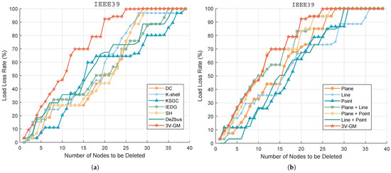 Load loss rate under an ordered node attack. (a) Performance comparison between the proposed 3V-GM method and six baseline algorithms (summaries of baseline methods are provided in Table 1). (b) Ablation study of the proposed point–line–plane framework, including plane-only importance, line-only importance, point-only importance, and the combined configurations of line + plane, line + point, and plane + point.