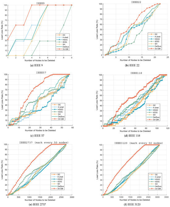 As shown in Figure 7, stepwise node removal simulations were performed on multiple power networks based on criticality classification. Specifically, as illustrated in Figure 7b–d, although the initial performance of the proposed 3V-GM was not always optimal, as the number of deleted nodes increased, its load loss rate was the first to reach 1 and it almost always outperformed other methods. Furthermore, as seen in Figure 7a,e,f, the proposed method consistently maintained superior performance, demonstrating its overall advantage. Specifically, as shown in Table 3, when 20% of the nodes are removed, 3V-GM causes a 33.03% average load loss rate across all experimental networks, far exceeding those of DeZbus (19.31%), IEDC (15.87%), and K-shell (13.88%). This advantage amplifies as the removal ratio increases, reaching 97.86% at 80% removal, compared to the next-best method, DeZbus (84.34%). By accurately prioritizing high-impact areas, the method provides robust decision support for the maintenance of grid stability and operational efficiency, forming a strong basis for the optimization of scheduling strategies and implementation of targeted node protection measures.