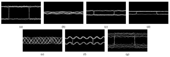 Eye diagrams under various types of interference: (a) clean signal, (b) CWI, (c) chirp interference, (d) pulse interference, (e) FMI, (f) AMI, and (g) spoofing interference.