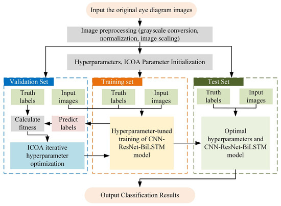 In this study, the classification problem for suppression and deception interference signals is addressed by proposing an ICOA–CNN–ResNet–BiLSTM hybrid model (Figure 3). First, the original images are preprocessed by grayscaling, normalization, and scaling to extract the key features of the interference signals. Then, the processed data are divided into training, validation, and test sets for model training, hyperparameter tuning, and performance evaluation, respectively. In the model training stage, a hybrid architecture that combines a CNN, a ResNet, and BiLSTM is constructed to leverage their respective advantages in spatial feature extraction and temporal modeling. To improve model performance, key hyperparameters (such as the learning rate, number of neurons, and number of convolutional kernels) are iteratively optimized via the ICOA. The ICOA evaluates the difference between the prediction results and the actual labels on the validation set, calculates the fitness function, and dynamically adjusts the hyperparameter configuration to effectively avoid falling into local optima and enhance the model’s generalizability. Finally, the optimized hyperparameters are applied to the hybrid model to explore the deep spatial and temporal features of the interference signals fully. After the model training is complete, the test set is used to verify the performance, and the classification effect is evaluated in terms of metrics such as accuracy, recall, and the F1 score. The experimental results demonstrate that this method not only improves hyperparameter search efficiency but also effectively integrates spatial, temporal, and global features, thereby significantly enhancing the accuracy and robustness of deception interference signal recognition.