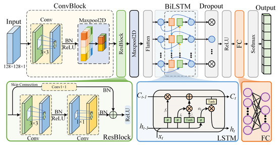 At the model design level, single-structure deep learning methods face significant limitations: traditional CNN models can extract local spatial features effectively, but they struggle to model long-range global context dependencies; BiLSTM models can capture the temporal dependencies of sequence data, helpful for modeling time-varying information content, but they are still constrained by the vanishing gradient problem when processing extremely long sequences; and deep residual network (ResNet [24]) alleviate the degradation issues of deep networks through skip connections, thereby enhancing feature propagation capabilities, but their primary advantage lies in spatial feature representation, capturing multi-scale informational structures, and they have relatively limited ability to capture complex dynamic patterns in signals that exhibit high temporal entropy. To overcome the inherent shortcomings of the above single models, we designed a CNN–ResNet–BiLSTM hybrid architecture. In this architecture, a CNN acts as a front-end feature extractor to efficiently capture the eye diagram features of interference signals, a ResNet integrates and deepens the features passed by the CNN layer and uses its powerful deep representation ability and the stability of residual learning to learn more robust and abstract discriminative patterns from multilevel features, and a BiLSTM network leverages its bidirectional temporal modeling capabilities to understand the temporal and spatial correlations of signals in detail and capture the unique long-term and short-term dynamic evolution patterns of fraudulent signals. Through innovative model design, this approach effectively combines the spatial feature extraction advantages of CNN, the deep feature abstraction and stability optimization characteristics of ResNet, and the bidirectional temporal modeling capabilities of BiLSTM, thereby significantly improving the classification performance for complex and diverse interference signals.