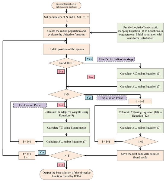 To address the inherent shortcomings of the COA in high-dimensional complex search spaces, such as becoming stuck in local optima and insufficient convergence accuracy, the proposed ICOA optimizes the existing COA through three core improvements: (1) In the population initialization stage, the traditional random initialization strategy is replaced with a logistic–tent chaotic mapping that combines the characteristics of logistic mapping and tent mapping, which significantly improves the uniformity and exploration of the initial population and lays a foundation for diversity in global search; (2) an elite perturbation strategy (EPS) is introduced, which applies periodic, adaptively decaying perturbations to the current optimal solution (elite individuals) and uses a greedy selection mechanism to dynamically inject controllable randomness to effectively escape from local optima; and (3) the dynamically decaying weight coefficients are dynamically optimized between the exploration and exploitation phases, which includes adjusting exploration intensity during the exploration phase and improving the original linear boundary contraction strategy to a nonlinear power-law contraction strategy with elite guidance during the exploitation phase, thereby collectively enhancing the algorithm’s global exploration capability and local optimization efficiency in complex search spaces. The process of the ICOA (Figure 5) is as follows.