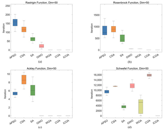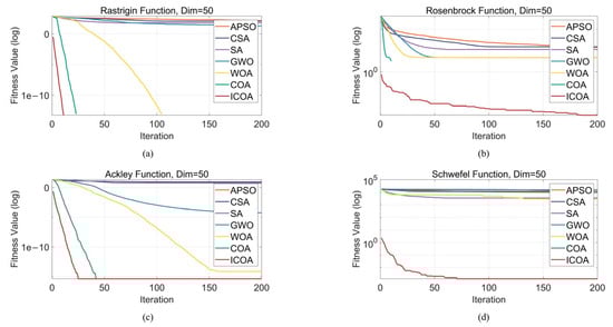 Four classic optimization test functions (the Rastrigin, Rosenbrock, Ackley, and Schwefel functions) were used as benchmarks (Table 2) to comprehensively evaluate the performance of the LCAVOA. These functions each have their own distinctive characteristics (such as strong oscillations, coexistence of flat regions and steep valleys, and narrow flat valleys), which were used to systematically examine the algorithm’s global search capability, convergence behavior, and solution accuracy. By comparing it with the APSO algorithm, CSA, SA algorithm, GWO algorithm, WOA, and COA, we analyzed the performance of the ICOA in terms of accuracy, speed, and stability. All the experiments were conducted under uniform conditions: a population size of 60, a maximum of 200 iterations, and 50 dimensions.