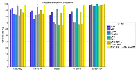 The experiments were conducted on a Windows 11 platform equipped with an Intel Core i7-9700k processor (3.6 GHz, manufactured by Intel, USA), 32 GB of DDR4 memory (manufactured by Samsung, Korea), and an NVIDIA RTX 3070 Ti graphics card (manufactured by NVIDIA, USA). The comparison model framework consisted of four levels: (1) traditional machine learning (SVM and MLP); (2) basic deep learning units (LSTM, BiLSTM, CNN, and GRU [33]); (3) composite structures (CNN-BiLSTM [34] and CNN-LSTM); and (4) the deep hybrid model ICOA–CNN–ResNet–BiLSTM.