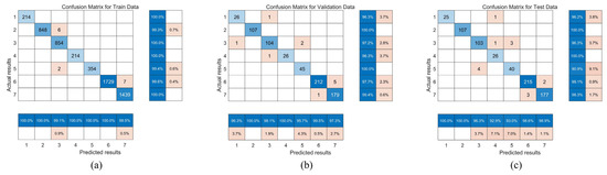 We plotted the confusion matrices of the classification results of the ICOA–CNN–ResNet–BiLSTM model on three datasets (Figure 9). Each cell in the confusion matrix represents a match between the actual category and the predicted category, where the numbers on the diagonal represent the numbers of correctly classified samples and the numbers off the diagonal represent the numbers of misclassified samples. In addition, the corresponding accuracy and error rate were calculated for each category to more intuitively evaluate the model’s performance on each category.