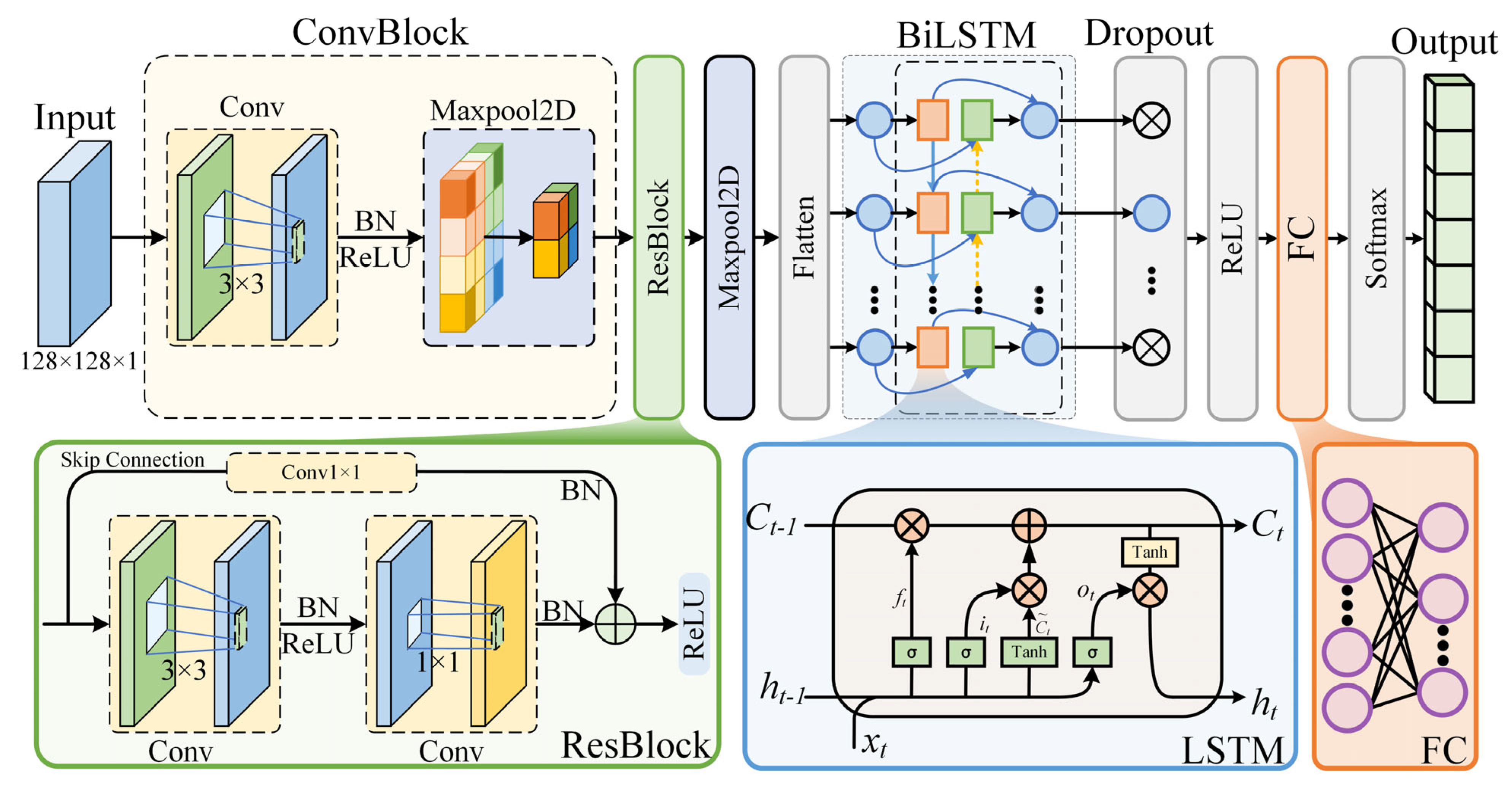 24]) alleviate the degradation issues of deep networks through skip connections, thereby enhancing feature propagation capabilities, but their primary advantage lies in spatial feature representation, capturing multi-scale informational structures, and they have relatively limited ability to capture complex dynamic patterns in signals that exhibit high temporal entropy. To overcome the inherent shortcomings of the above single models, we designed a CNN–ResNet–BiLSTM hybrid architecture. In this architecture, a CNN acts as a front-end feature extractor to efficiently capture the eye diagram features of interference signals, a ResNet integrates and deepens the features passed by the CNN layer and uses its powerful deep representation ability and the stability of residual learning to learn more robust and abstract discriminative patterns from multilevel features, and a BiLSTM network leverages its bidirectional temporal modeling capabilities to understand the temporal and spatial correlations of signals in detail and capture the unique long-term and short-term dynamic evolution patterns of fraudulent signals. Through innovative model design, this approach effectively combines the spatial feature extraction advantages of CNN, the deep feature abstraction and stability optimization characteristics of ResNet, and the bidirectional temporal modeling capabilities of BiLSTM, thereby significantly improving the classification performance for complex and diverse interference signals.