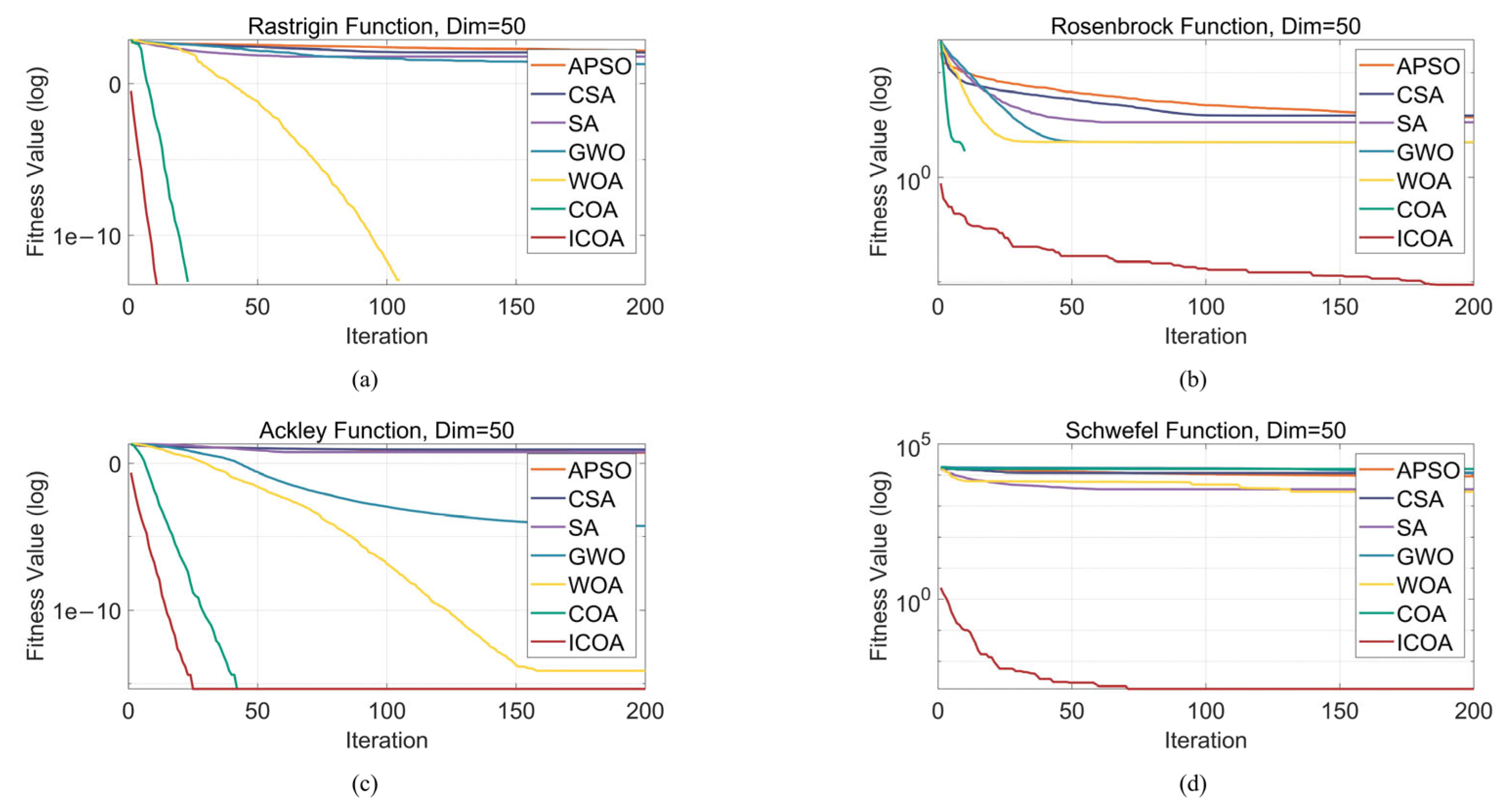 Owing to the complex multipeaked nature of the Schwefel function, optimization algorithms face greater challenges. The optimal solutions of the CSA, GWO algorithm, and COA all exceeded 10,000 and were far from the ideal solution of 0; the optimal solutions of the APSO algorithm, SA algorithm, and WOA remained in the 103–104 range; and the ICOA achieved an optimal solution in the 10−4 range, thus performing the best.