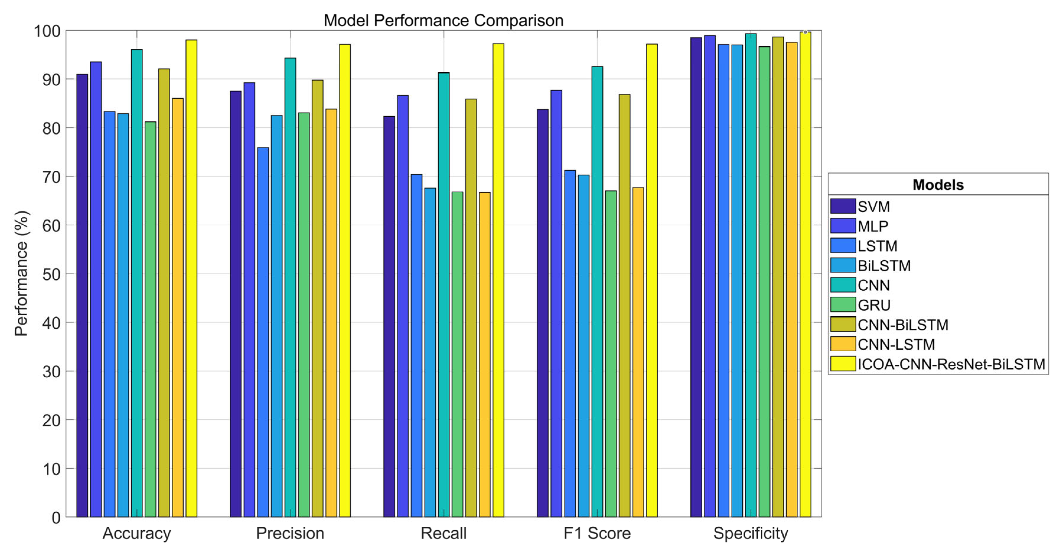 Figure 3). First, the original images are preprocessed by grayscaling, normalization, and scaling to extract the key features of the interference signals. Then, the processed data are divided into training, validation, and test sets for model training, hyperparameter tuning, and performance evaluation, respectively. In the model training stage, a hybrid architecture that combines a CNN, a ResNet, and BiLSTM is constructed to leverage their respective advantages in spatial feature extraction and temporal modeling. To improve model performance, key hyperparameters (such as the learning rate, number of neurons, and number of convolutional kernels) are iteratively optimized via the ICOA. The ICOA evaluates the difference between the prediction results and the actual labels on the validation set, calculates the fitness function, and dynamically adjusts the hyperparameter configuration to effectively avoid falling into local optima and enhance the model’s generalizability. Finally, the optimized hyperparameters are applied to the hybrid model to explore the deep spatial and temporal features of the interference signals fully. After the model training is complete, the test set is used to verify the performance, and the classification effect is evaluated in terms of metrics such as accuracy, recall, and the F1 score. The experimental results demonstrate that this method not only improves hyperparameter search efficiency but also effectively integrates spatial, temporal, and global features, thereby significantly enhancing the accuracy and robustness of deception interference signal recognition.