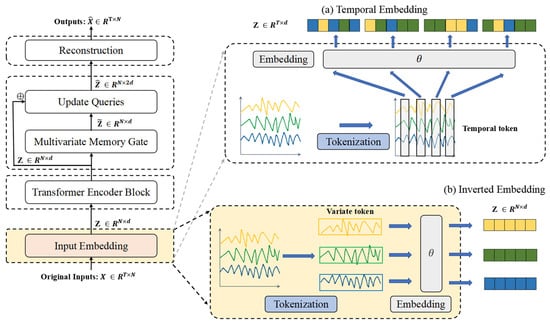 In multivariate time series modeling, data exhibits dual dimensions: temporal steps and variables. Conventional Transformer architectures typically adopt the temporal tokenization paradigm [31], where all variables at the same timestep are encoded into a single token vector. This representation treats timesteps as fundamental units, modeling temporal dependencies through attention mechanisms. In contrast, iTransformer innovatively proposes variable tokenization [10], treating entire temporal sequences of individual variables as independent tokens to achieve entity-centric embedding construction, explicit inter-variable interaction modeling, and preservation of variable-specific patterns. This paradigm shift demonstrates embedding techniques’ adaptability to domain-specific inductive biases through aligned vectorized representations, providing novel multivariate time series feature-learning perspectives with validated superiority. Unlike T-Rep’s time embeddings [32] that explicitly encode temporal positions, our inverted embedding discards absolute timing to prioritize cross-variable dependencies.