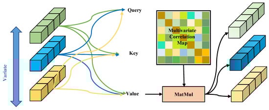 The structural composition of the Transformer encoder block is presented in Figure 3. A schematic diagram illustrating the multi-head attention mechanism under multivariate attention circumstances is provided in Figure 4. Note that the variable z in Figure 4 has dimensions N × d, indicating that each input vector represents an embedding of a specific variable rather than a temporal embedding. The inverted embedding applies a linear transformation to each subsequence: Z = , where , is the projection matrix, output preserves original timesteps, and no activation function or bias term is applied.