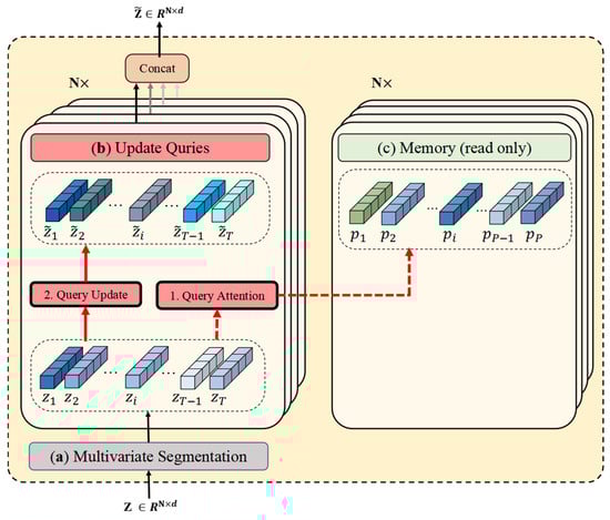 Multivariate memory module in inference mode. (a) Multivariate segmentation. (b) The Update Queries operation. (c) The multivariate memory gate (read only).