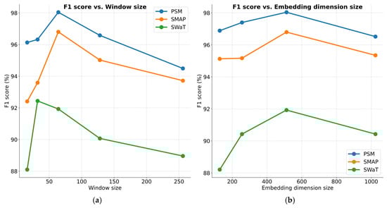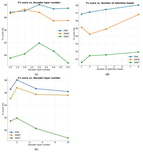 Figure 7a presents a comparative analysis of model effectiveness under varying window lengths. When the window size is smaller than 32, performance significantly drops. A small window size provides limited contextual time information, but within the range of window sizes from 32 to 256, the model shows robustness, with performance fluctuations of less than 2.31%. Figure 7b shows the performance results for different embedding dimension sizes. Overall, the effectiveness of the proposed method remains consistent across varying conditions. However, for the SWaT dataset, performance drops noticeably when the embedding dimension is reduced to 128. A very small embedding dimension may result in insufficient extraction of window timestep information, affecting the learning of representations in conjunction with the multivariate memory units. In the implementation, we used a window size of 64 to balance memory consumption and computational efficiency. Figure 7c,d illustrate the performance results across varying numbers of encoder layers and attention heads, respectively. Overall, the model’s performance remains stable. Figure 7e highlights the impact of different decoder layer numbers on performance. A smaller number of decoder layers leads to performance degradation due to insufficient reconstruction capability for input data, while an excessive number of layers increases the risk of over-generalization and reduces computational efficiency.