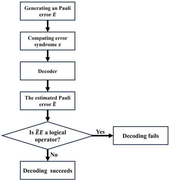 To understand the general idea of determining the upper bound of code distance through the Monte Carlo method, it is necessary to comprehend the procedure of quantum error-correction simulations shown in Figure 3. As shown in Figure 3, the first step is to randomly generate a Pauli error E and compute the corresponding error syndrome s. Then s is input into a decoder, and subsequently, the decoder outputs an estimated Pauli error whose corresponding syndrome is also s. The last step is to compute ; if it is a logical operator, decoding is failed. Otherwise it is a stabilizer, and the decoding procedure succeeds.