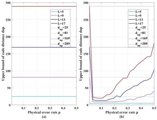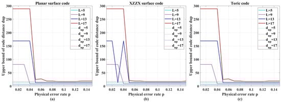 Figure 4a–c show the upper bounds determined by Algorithm 1 at varying physical qubit error rates for the planar surface, XZZX surface, and toric codes, respectively. Notably,