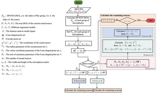 - In Solution-I, we aim to establish a regression model such thatwhere represents the true DOA, which is the parameters of the conical surface point sets A, and subsequently infer the true sound source coordinates in Step-II and Step-III (see Figure 1).