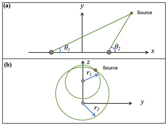 Below, we provide the method for solving and . For convenience, we will solve this in a two-dimensional local coordinate system (Figure 4a). We assume the center coordinates of the microphone pair are and , and the measured DOAs are and . Then and can be obtained by solving the equations
