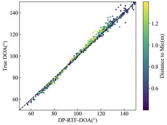 In the aforementioned method for localizing the 3D coordinates of a sound source, the precision of our approach hinges critically on the capability of each microphone array to accurately determine the DOA, which is instrumental in defining the conical surface point set A (Step-I). Our technique for ascertaining the DOA is grounded in the DP-RTF method [38]. Although this method can identify multiple sound sources in the presence of reverberation, it is not without its biases in DOA measurement, as illustrated in the accompanying Figure 6. Broadly speaking, the DP-RTF-DOA exhibits an incremental trend in alignment with the escalation of the true DOA. However, the true DOA corresponding to the DP-RTF-DOA is multi-valued, making it impossible to establish a direct functional mapping from DP-RTF-DOA to the true DOA. Nevertheless, when a specific distance from the microphone is given, this multi-valued phenomenon tends to diminish.