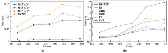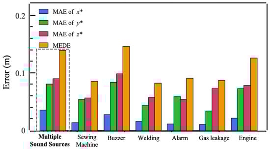 where , , and represent the errors in the inferred , , and . We not only evaluated the mean Euclidean distance error (MEDE) between the inferred and the true sound source coordinates, but also assessed the mean absolute error (MAE) of the inferred and the true sound source coordinates along the three axes. As shown in Figure 7b, Solution-II-SVR and Solution-III-SVR outperformed Solution-I-KRR. The MEDE between the true source position and the inferred source position in Solution-II-SVR and Solution-III-SVR are 10.5 cm and 10.0 cm, respectively, better than Solution-I- KRR’s 14.0 cm. The MAE for in all three solutions is under 3.0 cm, and for , it is under 8.0 cm. However, the MAE for in Solution-II-SVR and Solution-III-SVR is significantly lower than that in Solution-I-KRR.
