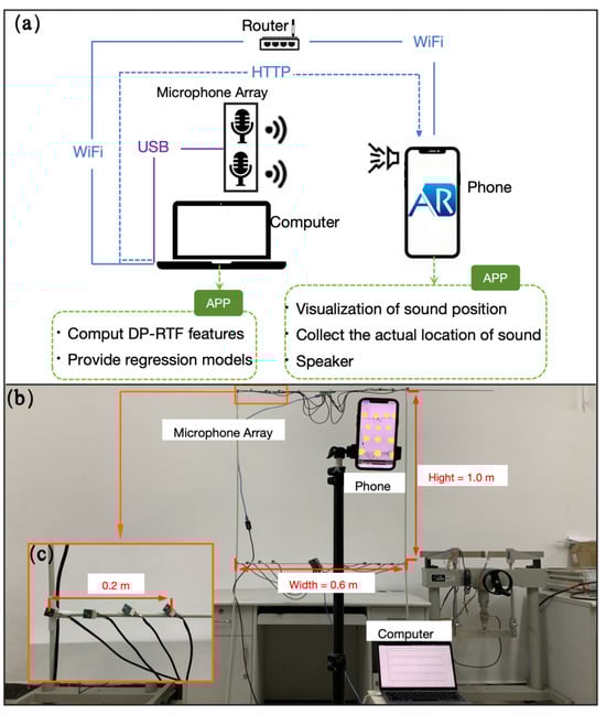 Practical case view. (a) Schematic diagram of the composition framework of the practical case. (b) Real component image of the practical case. (c) Image of the microphone pair.